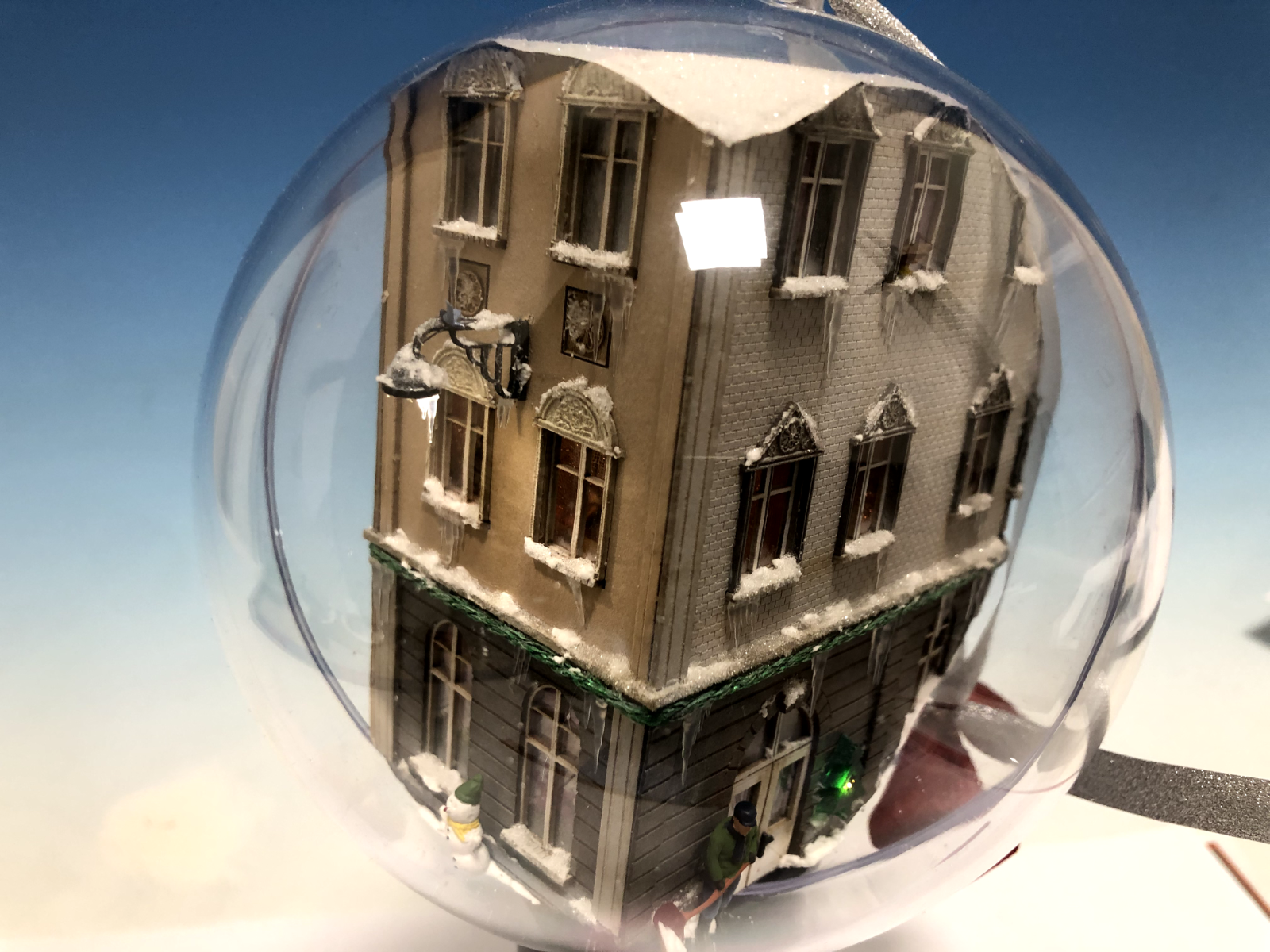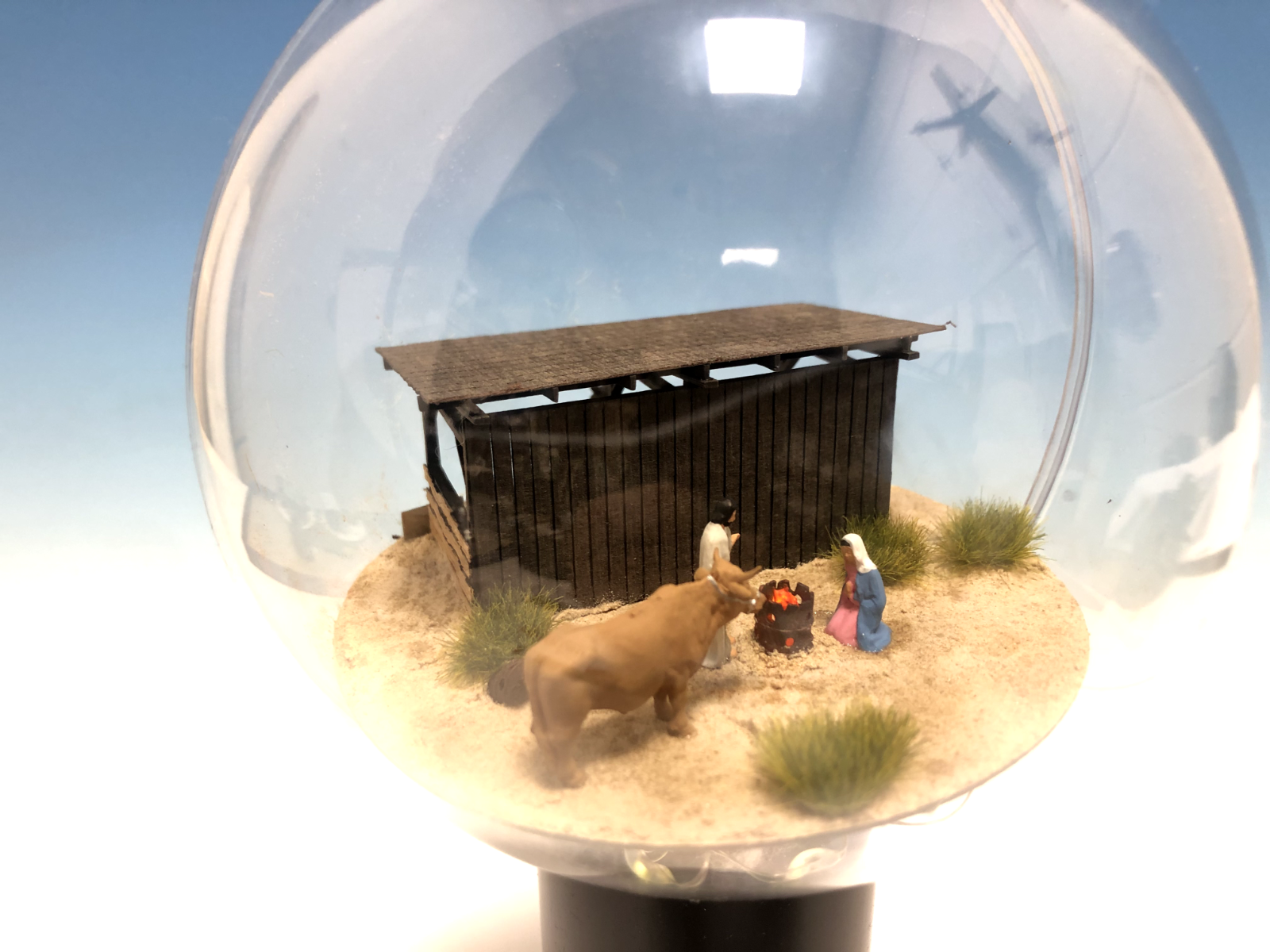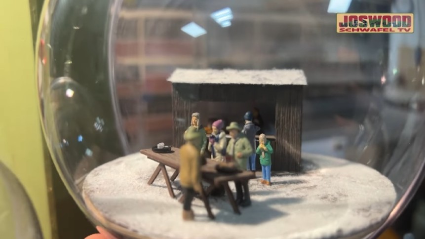 Acrylkugel, Durchmesser 12 cm, mit liebevoll und aufwendig gestalteter Modellbauszene in 1:87 Maßstab H0 . Unsere Modellbauer haben ihr Bestes gegeben, enorm viele Details sind zu finden, Figuren und feines Zubehör zuhauf.